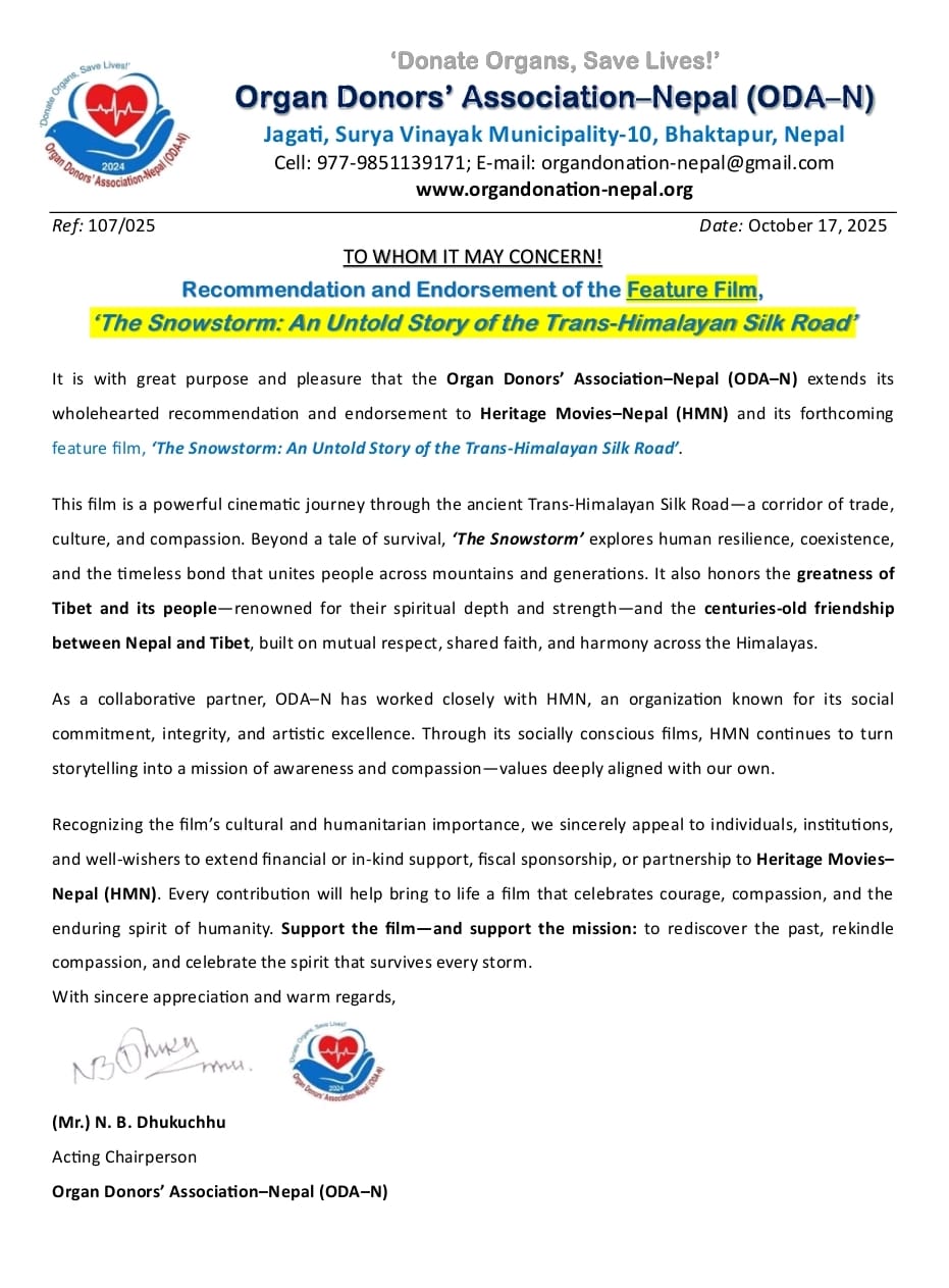 ‘The Rebirth: Life After the Last Breath’, is an impactful film that Heritage Movies–Nepal is going to produce in collaboration with the Organ Donors’ Association–Nepal (ODA–N).Themed around the global issue of organ donation, this ‘Movie with a Mission’ tells a story of universal resonance.Inspired by deeply moving real-life incidents in Nepal, its message transcends borders, cultures, and beliefs. At its heart, the film reflects the shared human experience, leaving a lasting impression that unites people across the world.More than just a narrative, it stands as a call to collective compassion—bringing audiences together in support of a profound and timeless cause: humanity itself.