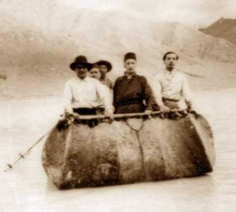 “Lhasa Banjas” (Newar traders conducting business in Lhasa) crossing the Yarlung Tsangpo (ཡར་ལུང་ཙང་པོ་ , Brahmaputra) river on a traditional yak-hide boat